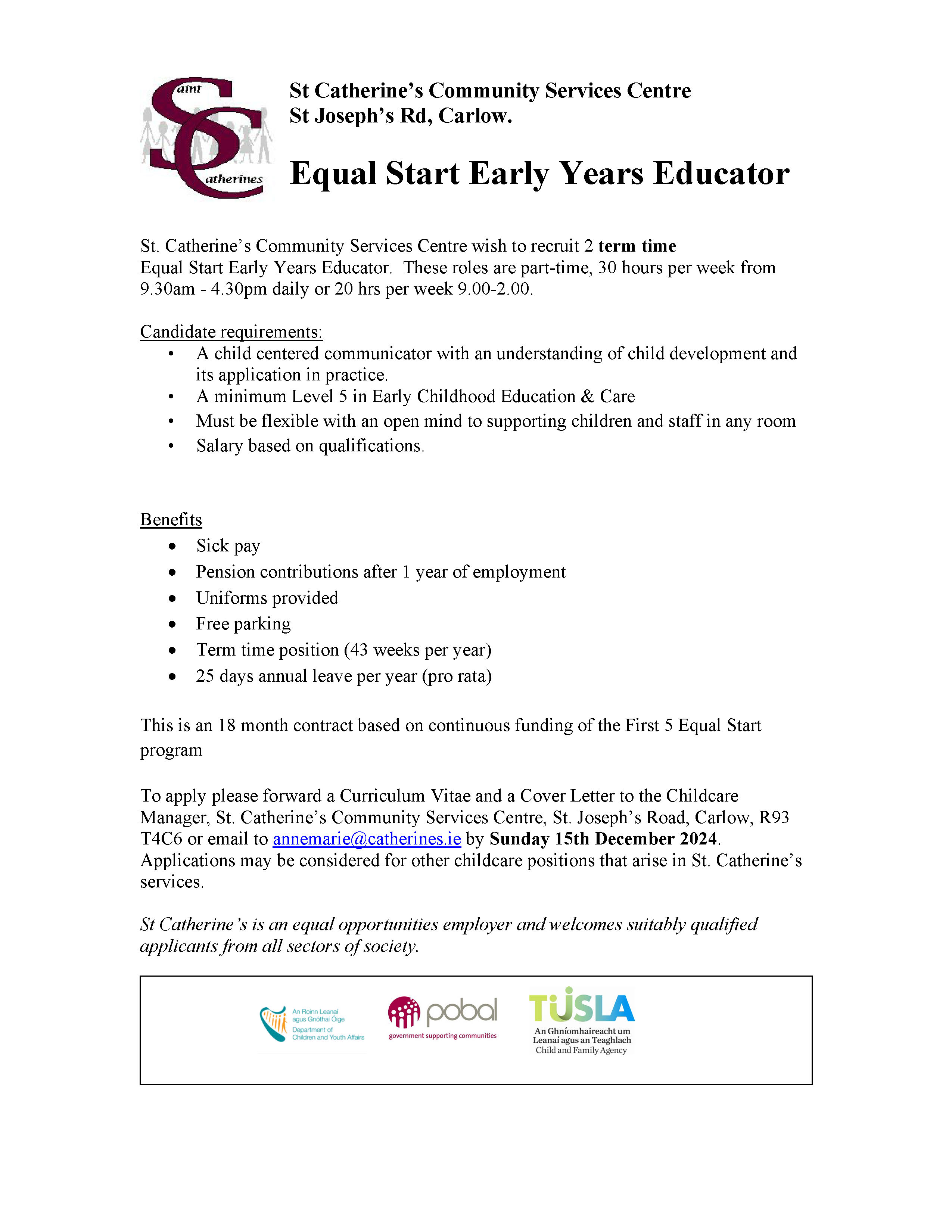Advertisement for Equal Start Practitioner 11 24December 5, 2024/by Carlow Childcare Committee https://carlowccc.ie/wp-content/uploads/2018/10/ccc4.jpg 0 0 Carlow Childcare Committee https://carlowccc.ie/wp-content/uploads/2018/10/ccc4.jpg Carlow Childcare Committee2024-12-05 13:00:102024-12-05 13:00:10Advertisement for Equal Start Practitioner 11 24