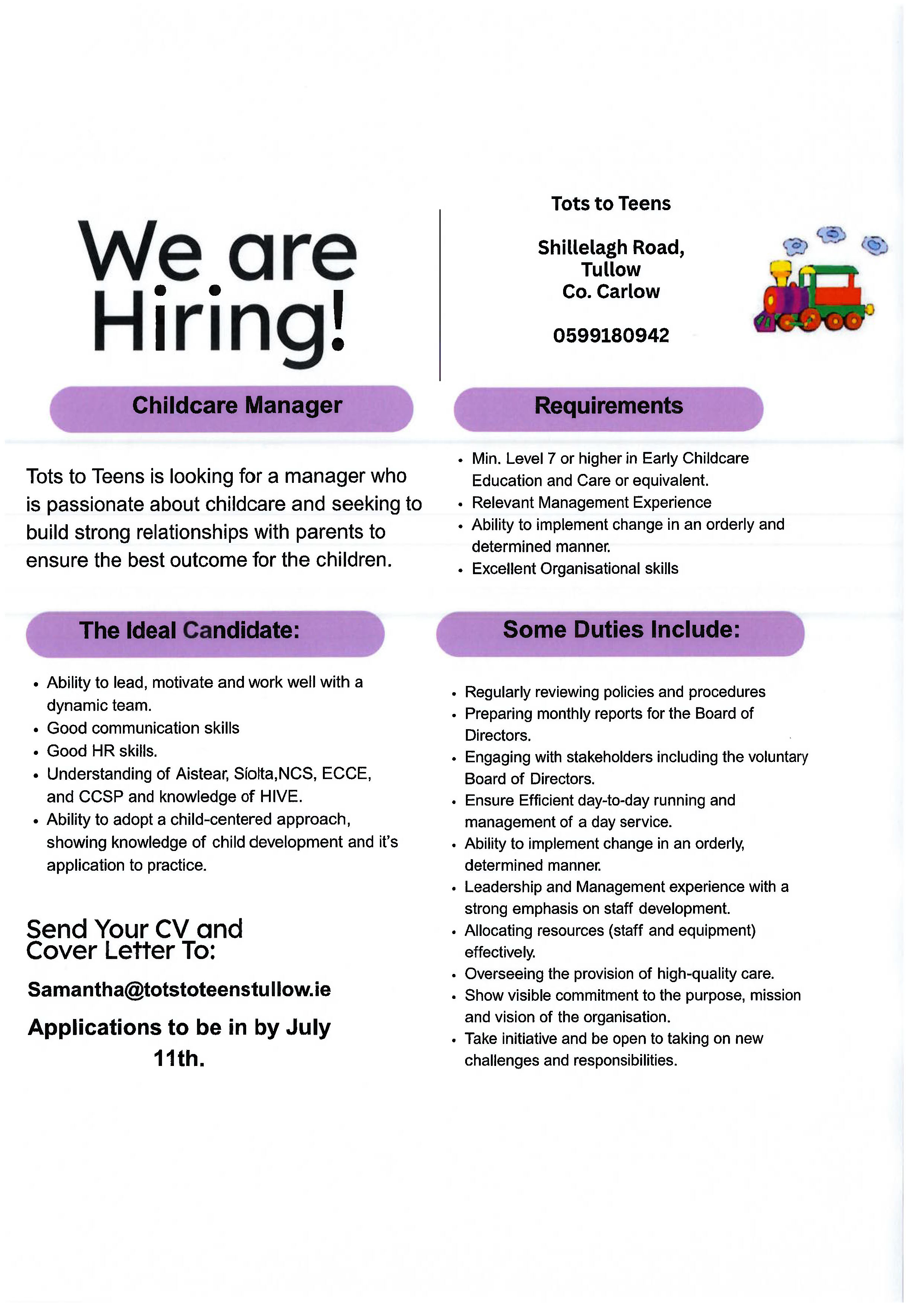 Tots to Teens Manager AdJune 30, 2025/by Carlow Childcare Committee https://carlowccc.ie/wp-content/uploads/2018/10/ccc4.jpg 0 0 Carlow Childcare Committee https://carlowccc.ie/wp-content/uploads/2018/10/ccc4.jpg Carlow Childcare Committee2025-06-30 09:04:072025-06-30 09:04:07Tots to Teens Manager Ad