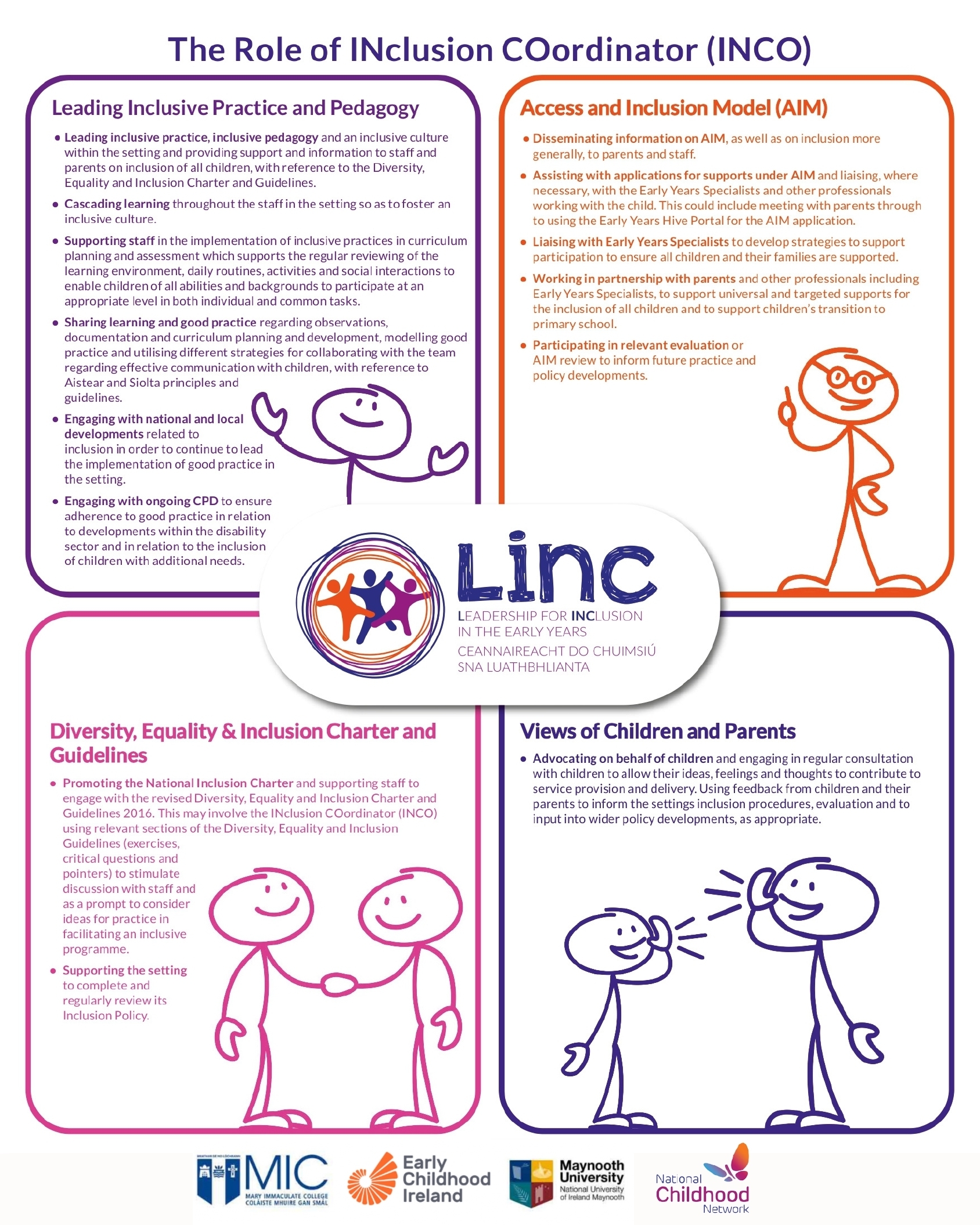 The Leadership for INClusion in the Early Years programme, LINC, is a Level 6 Special Purpose Award (Higher Education), that is designed to support the inclusion of children with additional needs in the early years. The course is offered free to people working within early years education and is fully funded by the Department of Children and Youth Affairs. Once qualified, graduates will perform the role of Inclusion Coordinator within their early years setting.