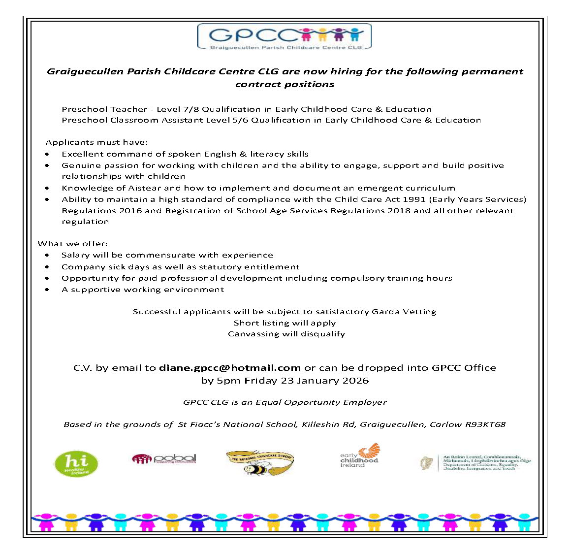 Preschool Teacher and Preschool Classroom AssistantJanuary 13, 2026/in Full-time/by Carlow Childcare Committee Graiguecullen , Carlow. January 13, 2026 Full-time Graiguecullen Parish Childcare Centre CLG https://carlowccc.ie/wp-content/uploads/2018/10/ccc4.jpg 0 0 Carlow Childcare Committee https://carlowccc.ie/wp-content/uploads/2018/10/ccc4.jpg Carlow Childcare Committee2026-01-13 10:14:522026-01-13 10:14:52Preschool Teacher and Preschool Classroom Assistant