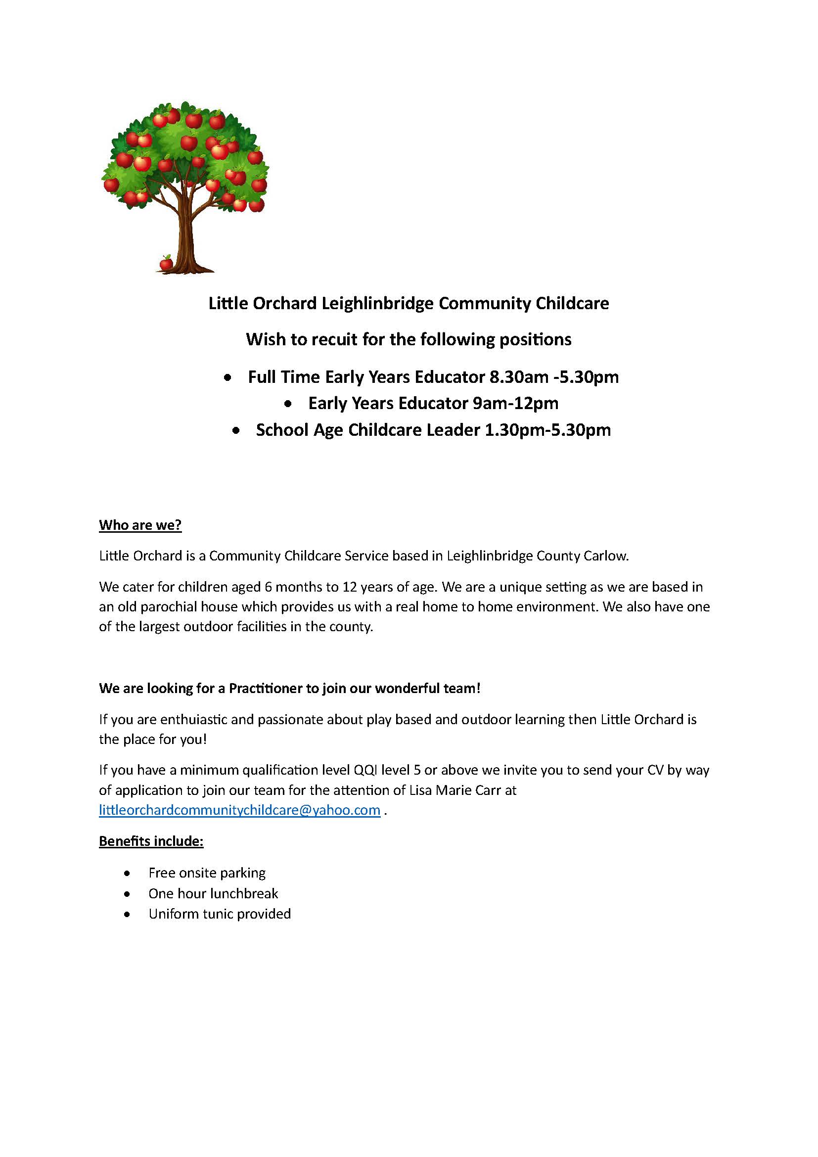 **Jobs Board: Early Years Educators and School Age Leader positions, Little Orchard, Leighlinbridge**