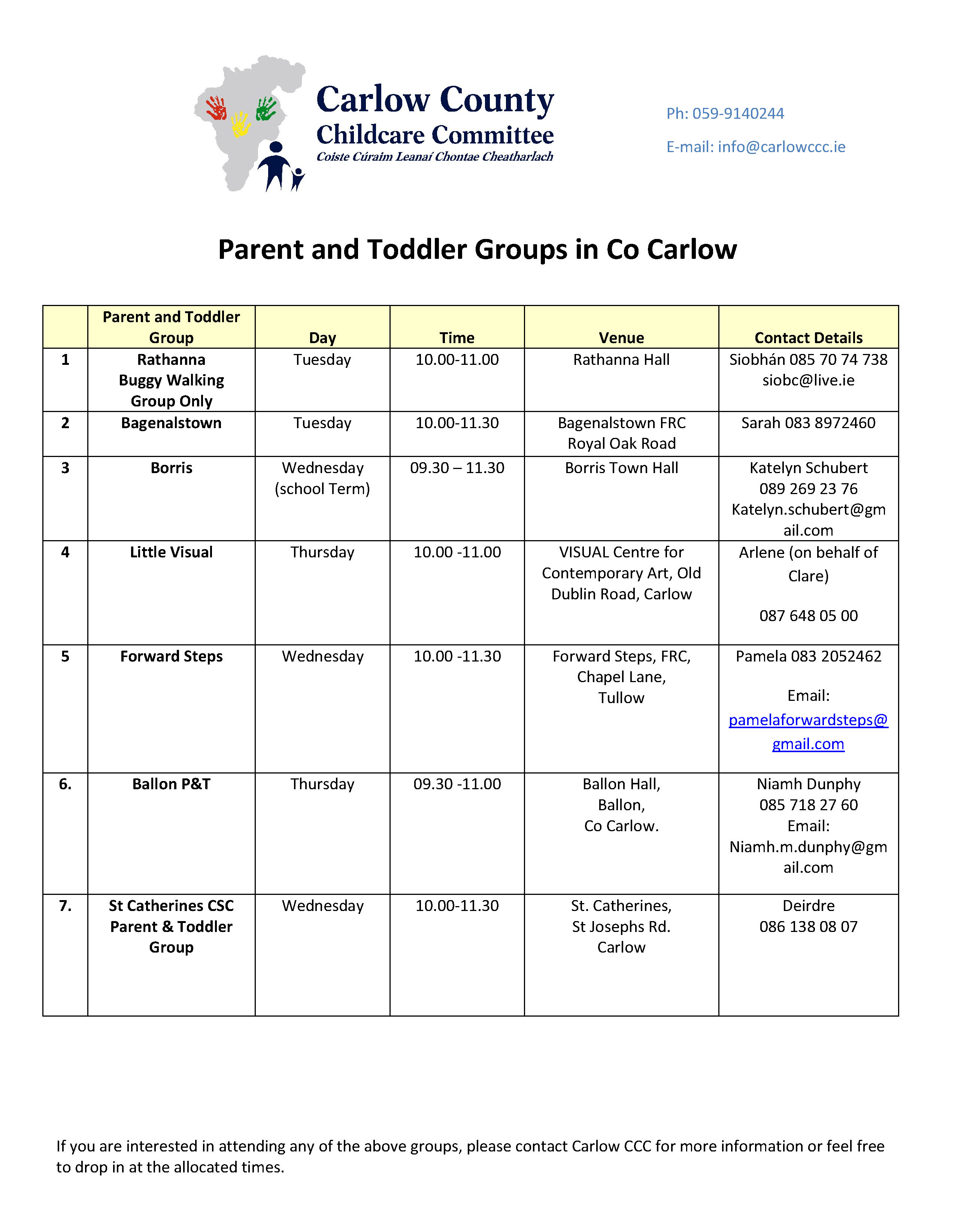 Please see list of Parent & Toddler groups in Co Carlow: